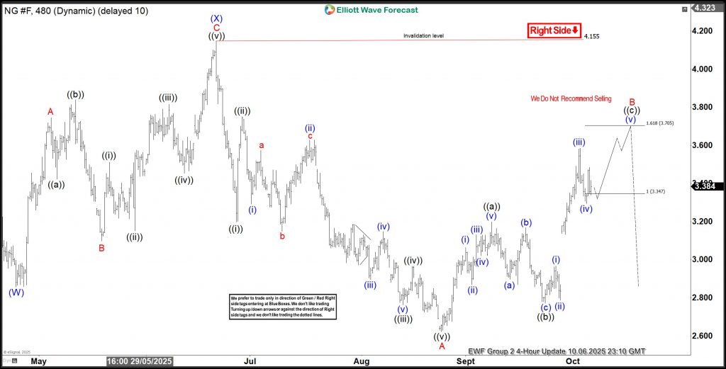 On 6th October, 2025, we shared the chart above. Wave B emerged higher as a simple 3-wave zigzag structure. We identify the extreme zone at 3.347-3.705 to members. In the live trading room and daily technical videos, we recommended to members to go short for a short term counter-trend trade (remember, NG is in a corrective phase).
